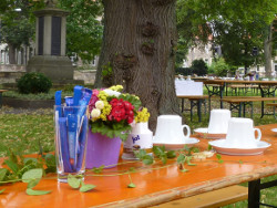 Schnell wurden einige der Tische unter die Bäume in den Schatten gerückt. Wer sich sein Picknick nicht selbst mitgebracht